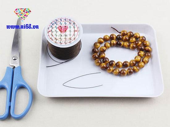 Chuẩn bị dụng cụ:– Chuỗi hạt.- Dây chỉ thun.- Kéo.- Kim xâu hoặc một đoạn dây thép mảnh gấp đôi lại thành kim.