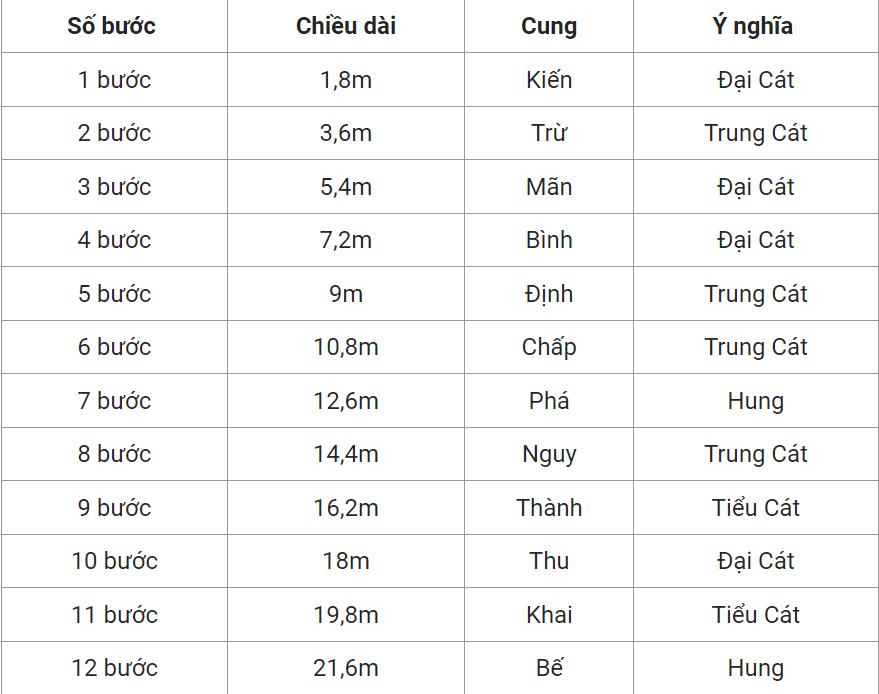 Cụ thể: 1 bước = 4 thước 5 tất. 1 bước là kiến, 2 bước là trừ, 3 bước là mãn, 4 bước là bình, 5 bước là định, 6 bước là chấp, 7 bước là phá, 8 bước là nguy, 9 bước là thành, 10 bước là thu, 11 là khai, 12 bước là bế. Những bước này cũng thể hiện điềm tốt điềm xấu.