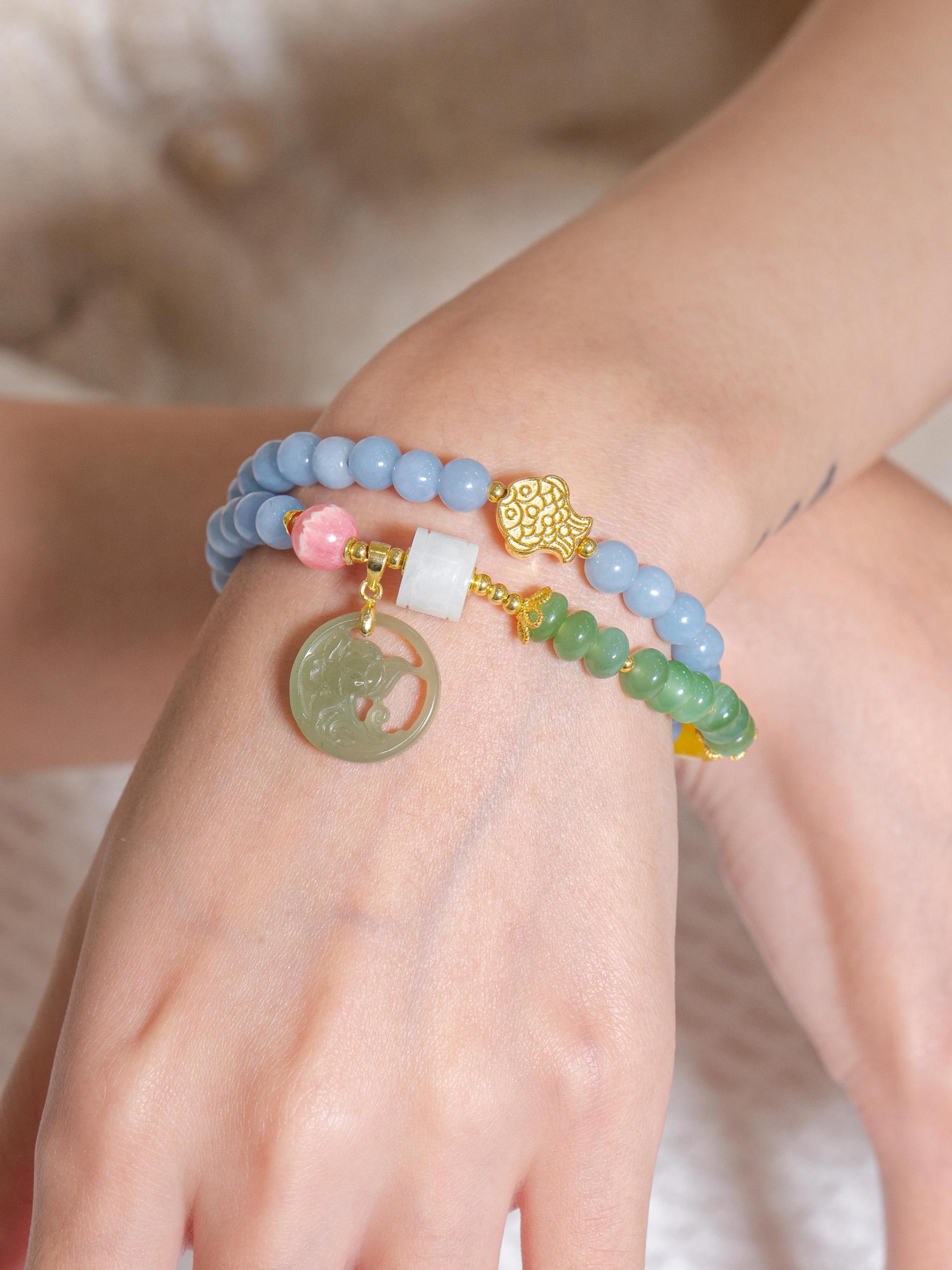 Amazonite có cái tên khác rất đẹp, nó còn được gọi là thiên hà xanh. Là loại đá đặt biệt, nó được đặt tên theo dòng sông Amazon, nơi đầu tiên tìm ra nó. Các viên đá sở hữu sắc xanh mềm mại rất hợp với người mệnh Thủy. Từng viên đá kết lại thành chuỗi vòng tay mang đến cảm giác sảng khoái, mát lành. Cải thiện sức khỏe tốt, đặc biệt là công dụng tăng cường sự hấp thụ canxi trong cơ thể.